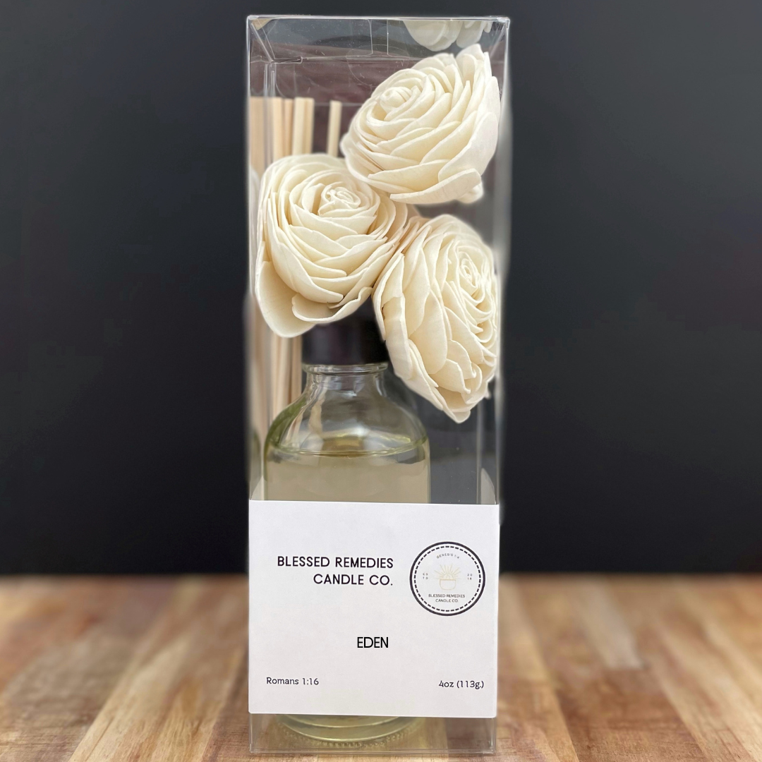 8oz Reed Diffuser featuring Wooden Flowers. Phthalate Free Fragrance oil and reusable glass bottles. Each diffuser comes packaged in a 12 clear box with 4 floral reeds.