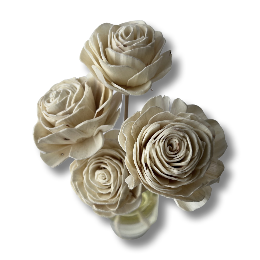 8oz Reed Diffuser featuring Wooden Flowers. Phthalate Free Fragrance oil and reusable glass bottles. Each diffuser comes packaged in a 12 clear box with 4 floral reeds.